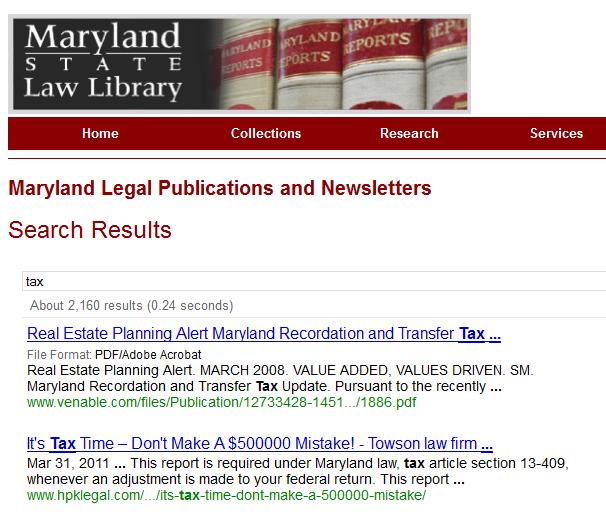 The Maryland State Law Library is pleased to announce a new tool for local legal research, Maryland Law Firm Publications Search. This new feature, simple in design and functionality, is comprised of a specialized Google search utility, which indexes the publications pages of the websites of the largest Maryland law firms. It is available from the “Maryland” link on the Library’s Databases page.