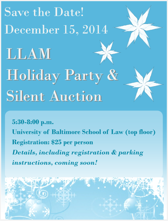 We hope you can join us for the LLAM Holiday Party & Silent Auction at the University of Baltimore on December 15, 2014. More information on registration will be coming soon, but email us at llamnewsmd@gmail.com if you have any questions!